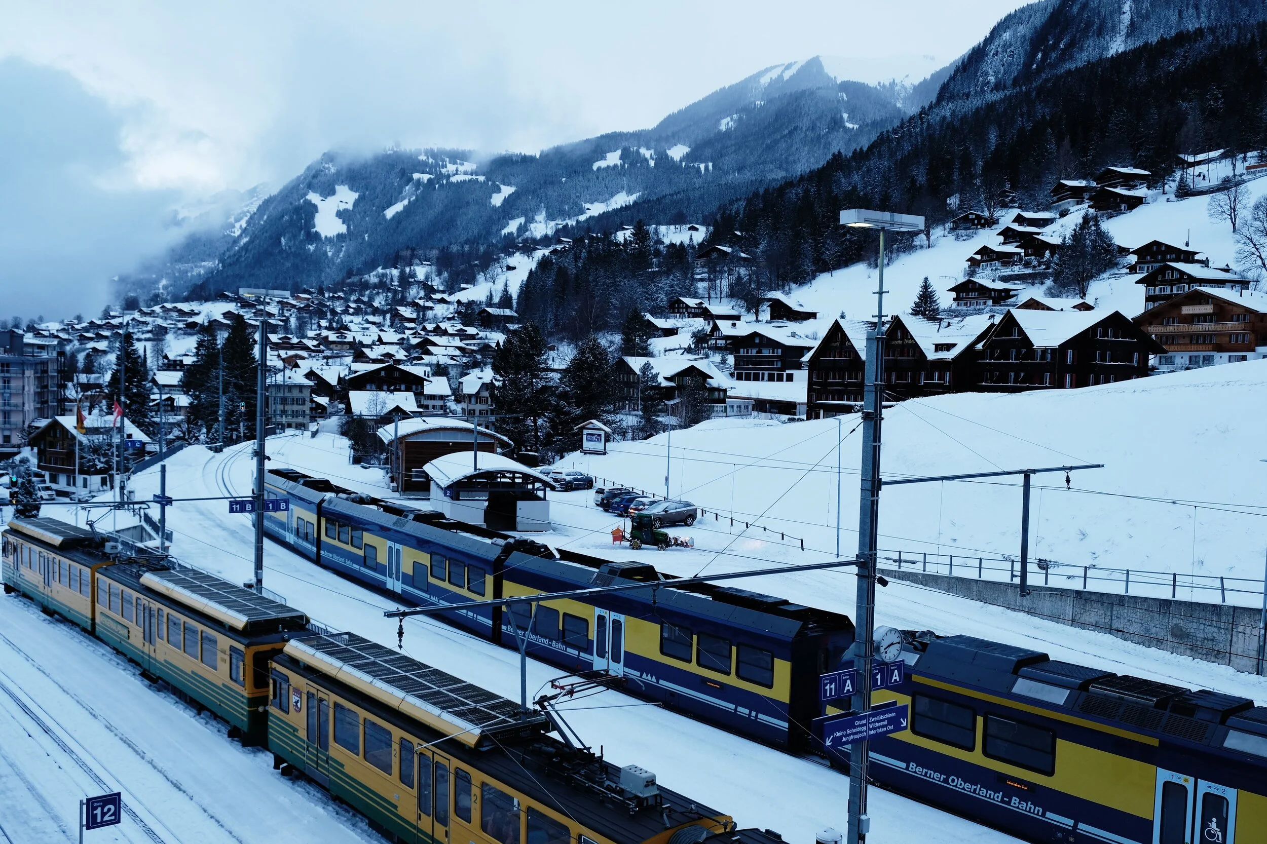 I stayed in a hotel right by the Grindelwald train station for 2 days and it made my travel around the region really easy. My hotel room faces right to the Grindelwald train station and every 30 minutes or so skiers and snowboarders load their gear onto the trains departing for various slopes across the Jungfrau region. As soon as you alight the train at Grindelwald, the 3 mountains - Eiger, Monch and Jungfrau - stand in front of you like towering rocks. Travelers drag their suitcases across the snowy platform while they admire the Jungfrau mountains in their direct path.