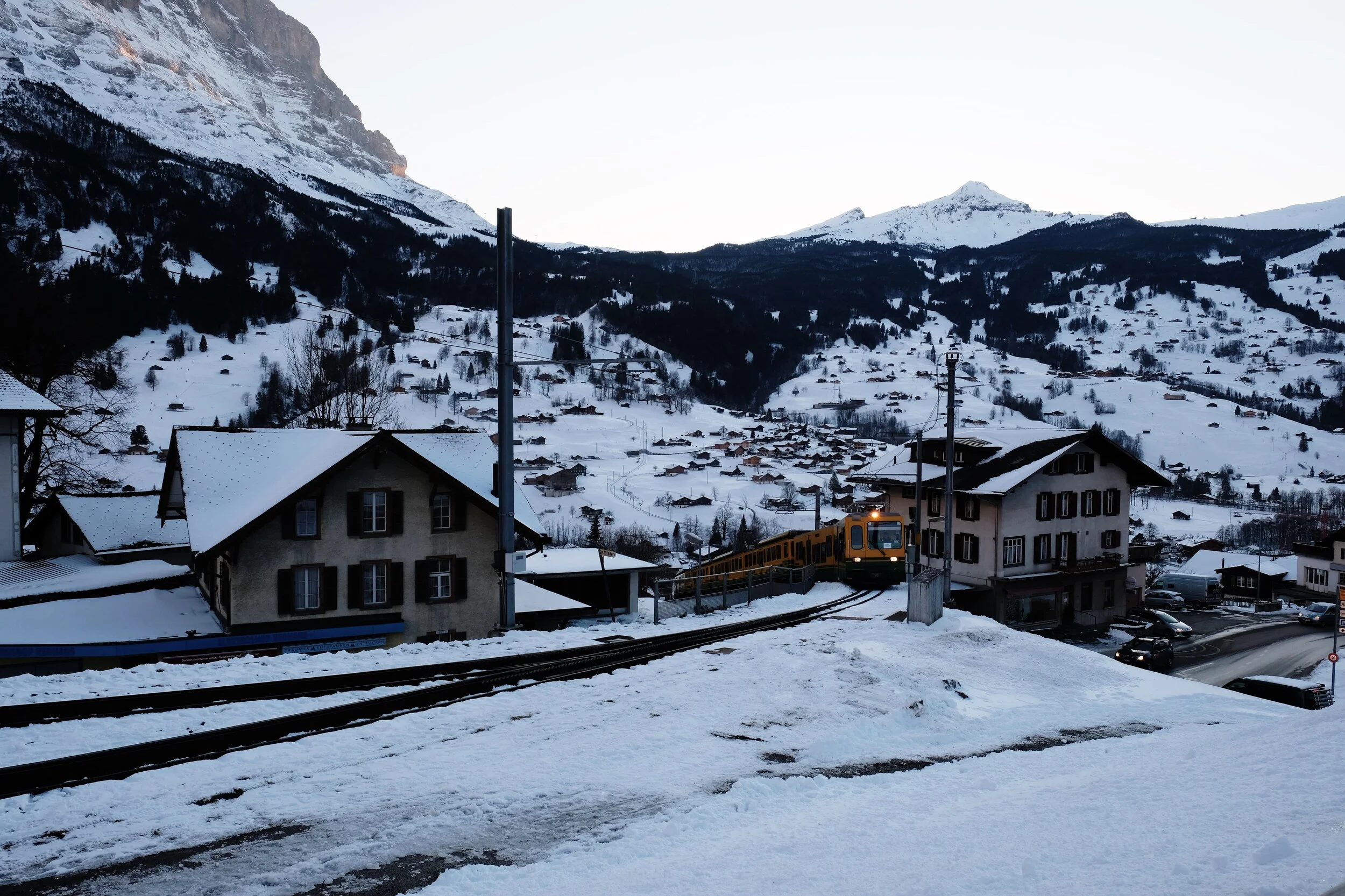 While waiting for the train at Grindelwald heading back to Interlaken for my last night in the area, I caught a train zipping its way through town and emerging between two buildings around sunset. Everyone was returning from their journey and heading back to their towns as the slopes cleared and night settled in.