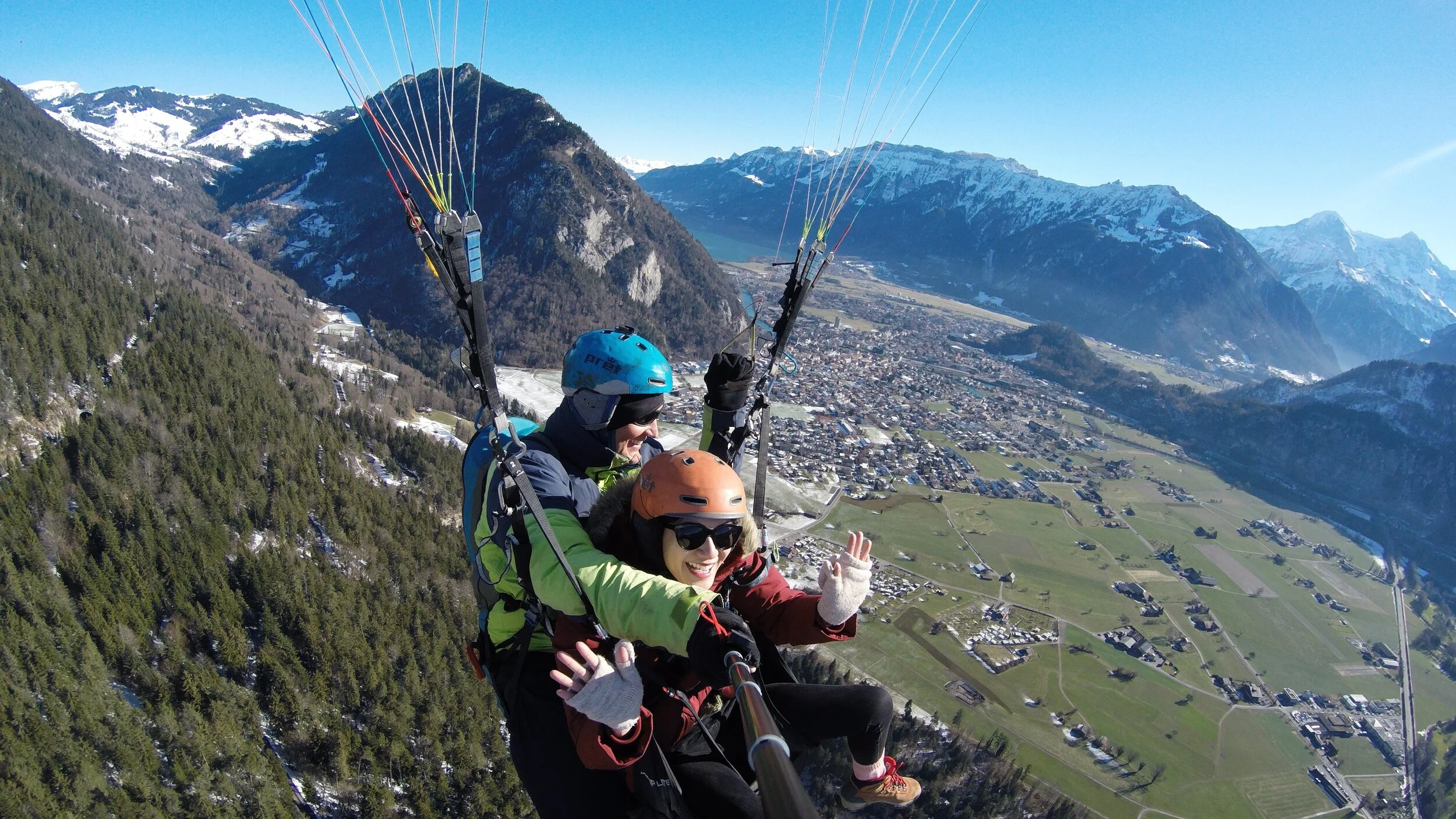 Albin handed me the GoPro, double checked our gear, and after he confirmed I was ready, we dashed forward. After a short moment I realized my feet weren’t touching the ground anymore and we were airborne. I remembered screaming in excitement as I stared into the mountains and the sun in front of me while Albin pulled the seat out for me. It really felt like I was in a chair flying. Albin pointed out their house to the right, and the two lakes connected by Interlaken as he circled around to show me his beautiful hometown. The real fun started when Albin asked me if I enjoyed rollercoaster and proceeded to do his maneuvers that left me screaming. We soared in the air for a little longer before Albin pointed out Gerti in the landing area below. After another round of maneuvers and me screaming (also giving Gerti a chance to record my screaming from down below), we made our perfect landing in the park.
