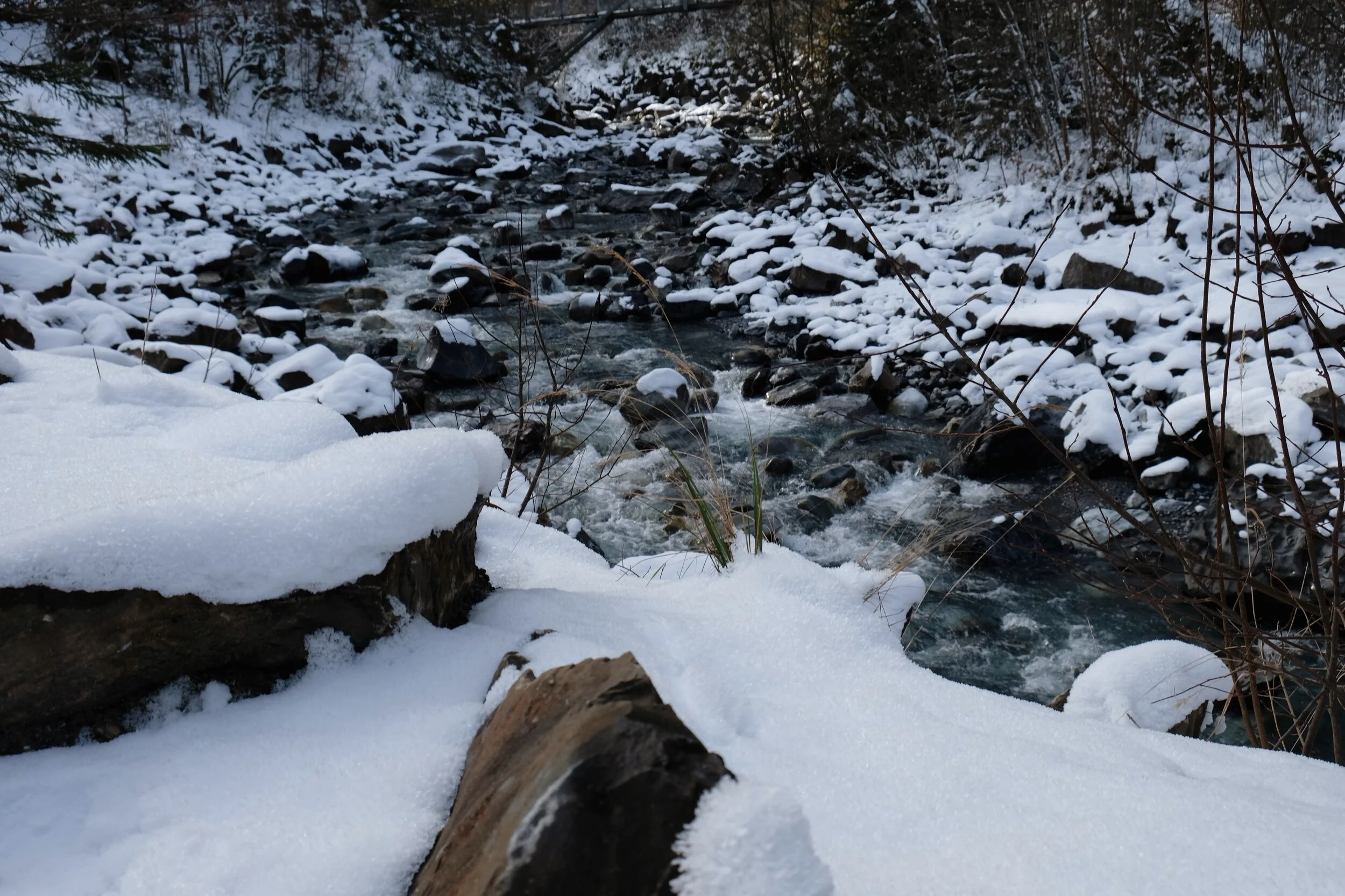 After a late lunch at a cafe in Mürren I made my way back to Lauterbrunnen as snowfall continued steadily throughout the afternoon. Lauterbrunnen is known for its waterfalls but its famous Trümmelbach Falls is closed during winter. The other waterfall, Staubbach Falls, is in the middle of the town and is visible from afar, but the walk up closer to the fall is also closed during winter. Unfortunately with the heavy snow and the water flow not at it’s maximum it was quite difficult to see the actual waterfall. I looked up the photos of the town and the waterfall in the summer time and it’s definitely worth a visit!