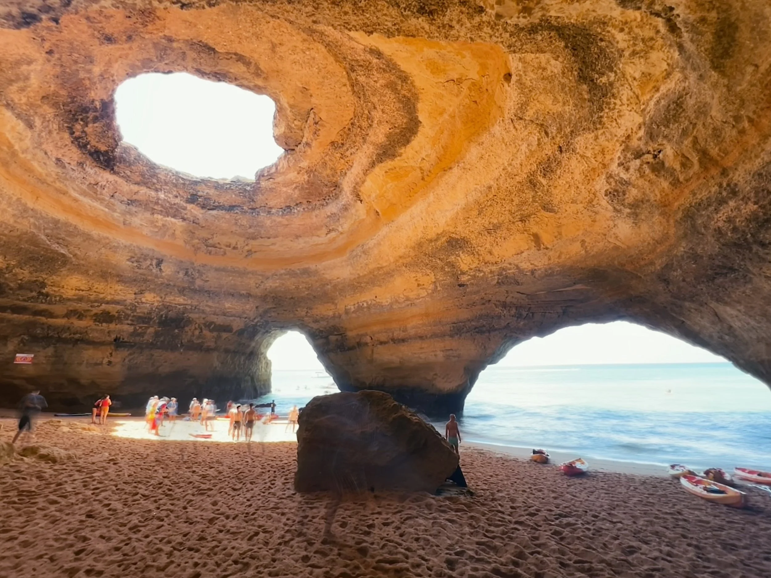 The next morning after a nice breakfast at Black and White cafe in Lagos, and took an uber over to Benagil (Ubers sometimes are hard to come by so have a backup plan since the only option for public transportation between Lagos and Benagil is the bus and it takes 2 hours, vs a 40 min taxi or uber ride). We met up with our guides Nuno and David for a small group kayaking tour of the Algarve coast. We put on sunscreen, stored our bags on the van, grabbed our paddles and headed to the beach. I was paired up with another single traveler Sabine who’s from Germany, and after a brief intro, we’re off! Nuno led the way with our group of 10, and our first stop is THE must see sight in Algarve, Algar de Benagil. Considered the most beautiful cave in the world, Algar de Benagil is a sea cave that has 3 openings - one at the top that serves as the skylight, and 2 arches that are just big enough for very small boats, kayaks and paddle boards to disembark on the beach within the cave. The openings are formed by thinning rocks, and the layers of the rings decaying away sometimes reveals fossils on the rocks.