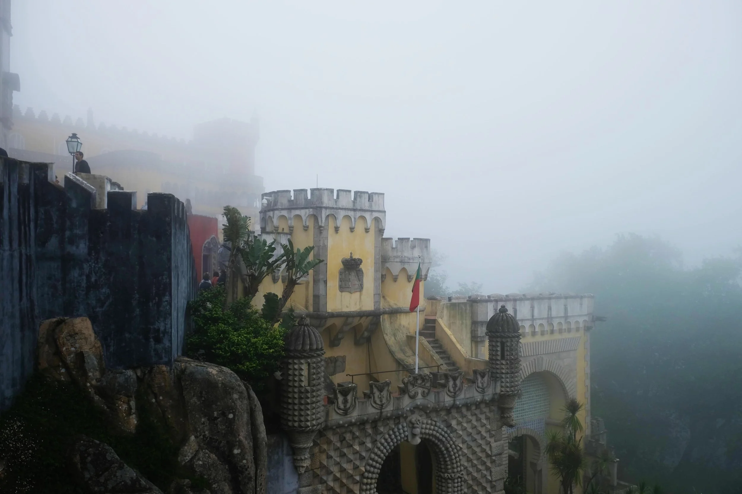 Following the long lines of people waiting to enter Pena Palace, we entered the Palace gates and onto the palace grounds. A path up through a forrest of very tall trees leads you to the actual palace. You can also opt for the trolley for a fee if you don’t want to go by foot, but be prepared to wait in another line. As we walked up the path we soon realize we won’t get a good view of the palace as the clouds kept rolling in. The temperature dropped pretty significantly and soon enough we were enclosed in dense fog and mist, with winds blowing strong. The yellow, red and blue structure appeared behind the clouds, and you can make out palace as you walk closer to the building.