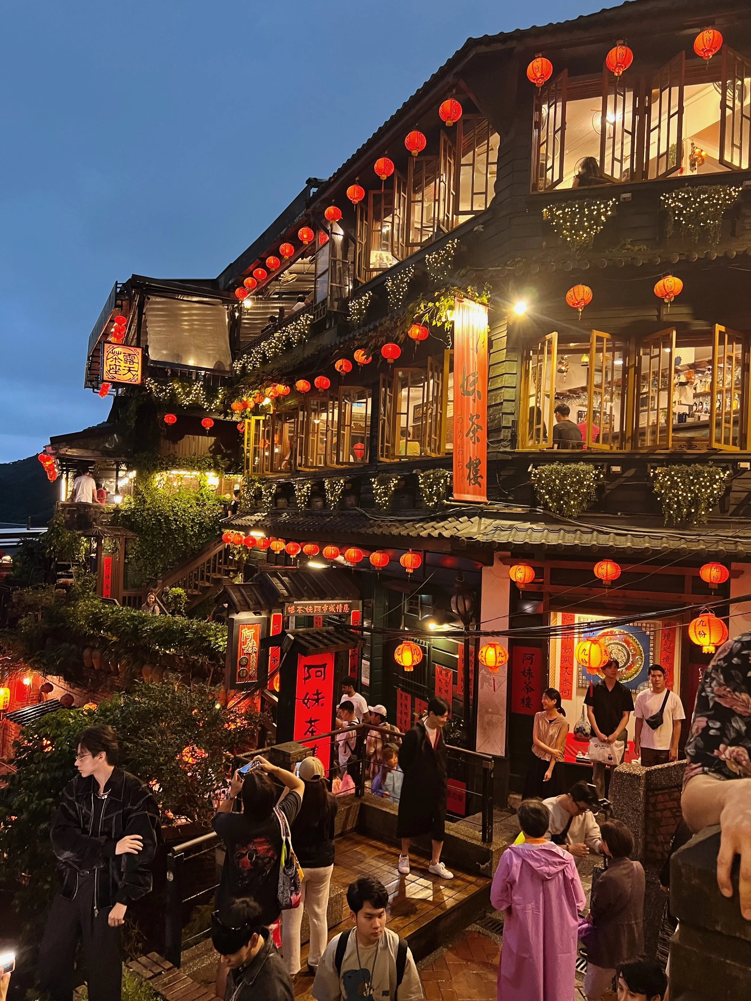 Our last activity of the evening in Juifen was a tea ceremony at A-mei Teahouse (阿妹茶樓). The staff showed us how to heat up the tea cups and smell the first brew of tea, and we got to do it ourselves for the next couple brews. By the time we ended at the teahouse the sun has completely set, leaving huge crowds outside gathering to take photos of the red lanterns lighting up the stairway.