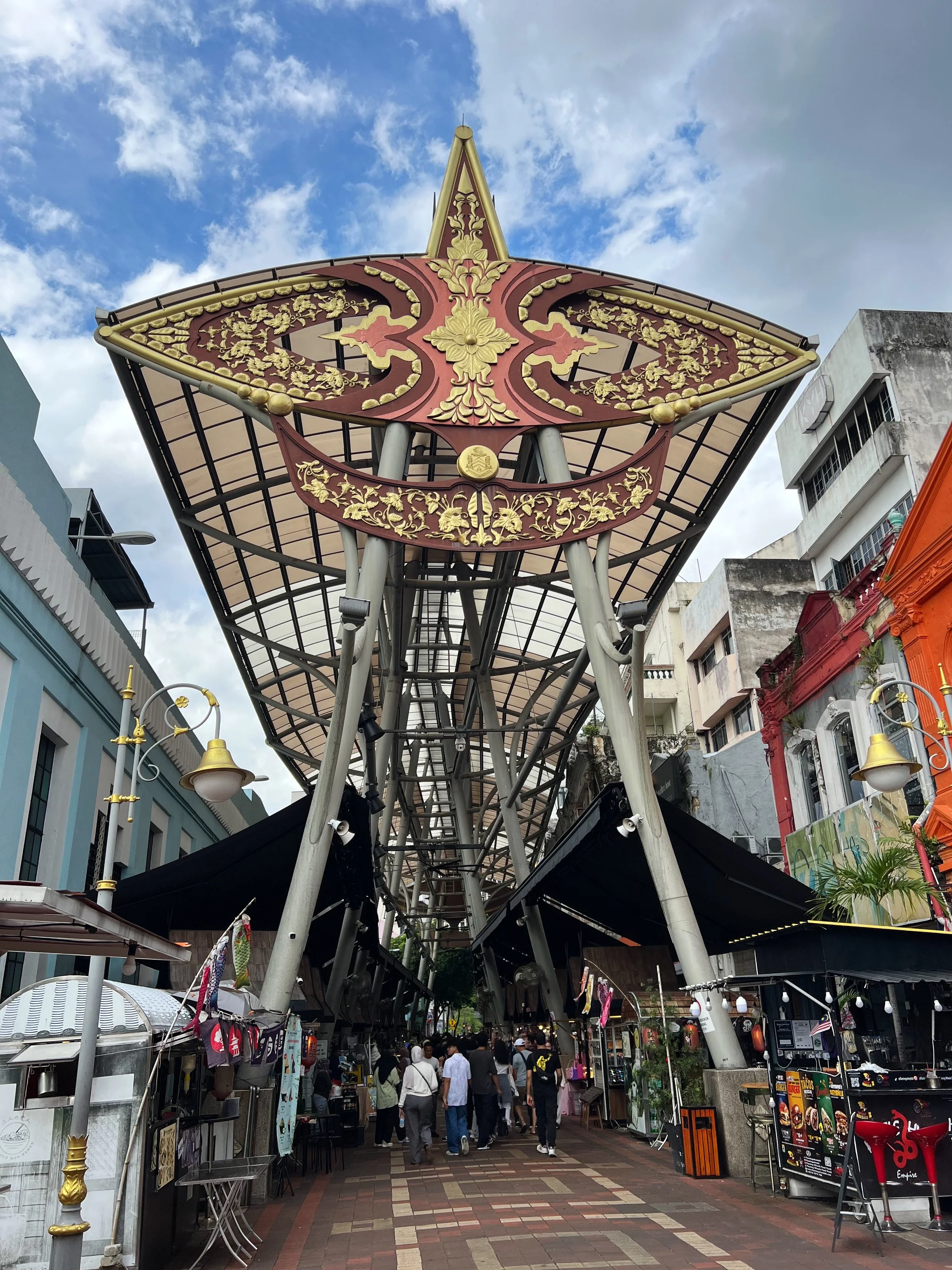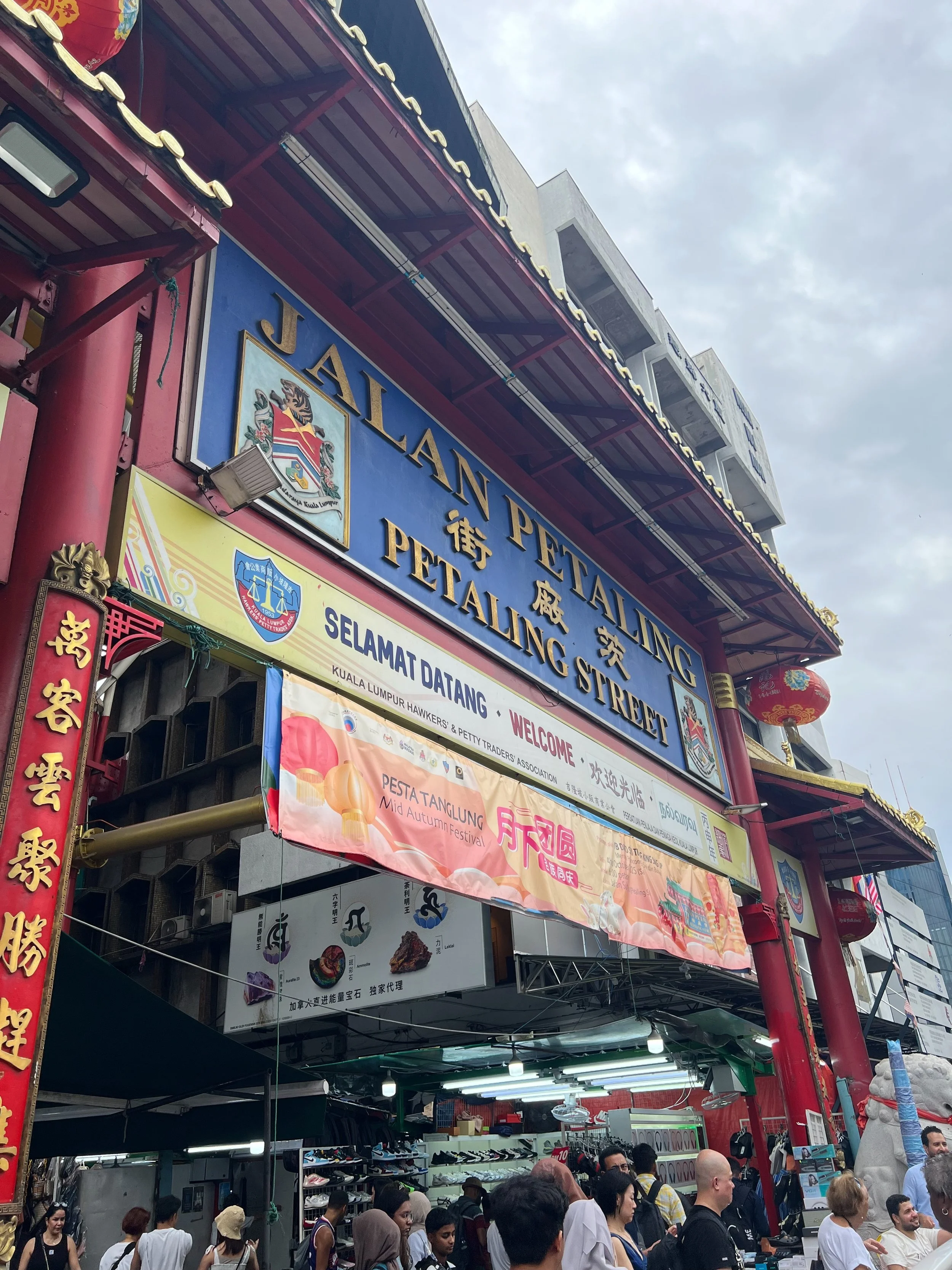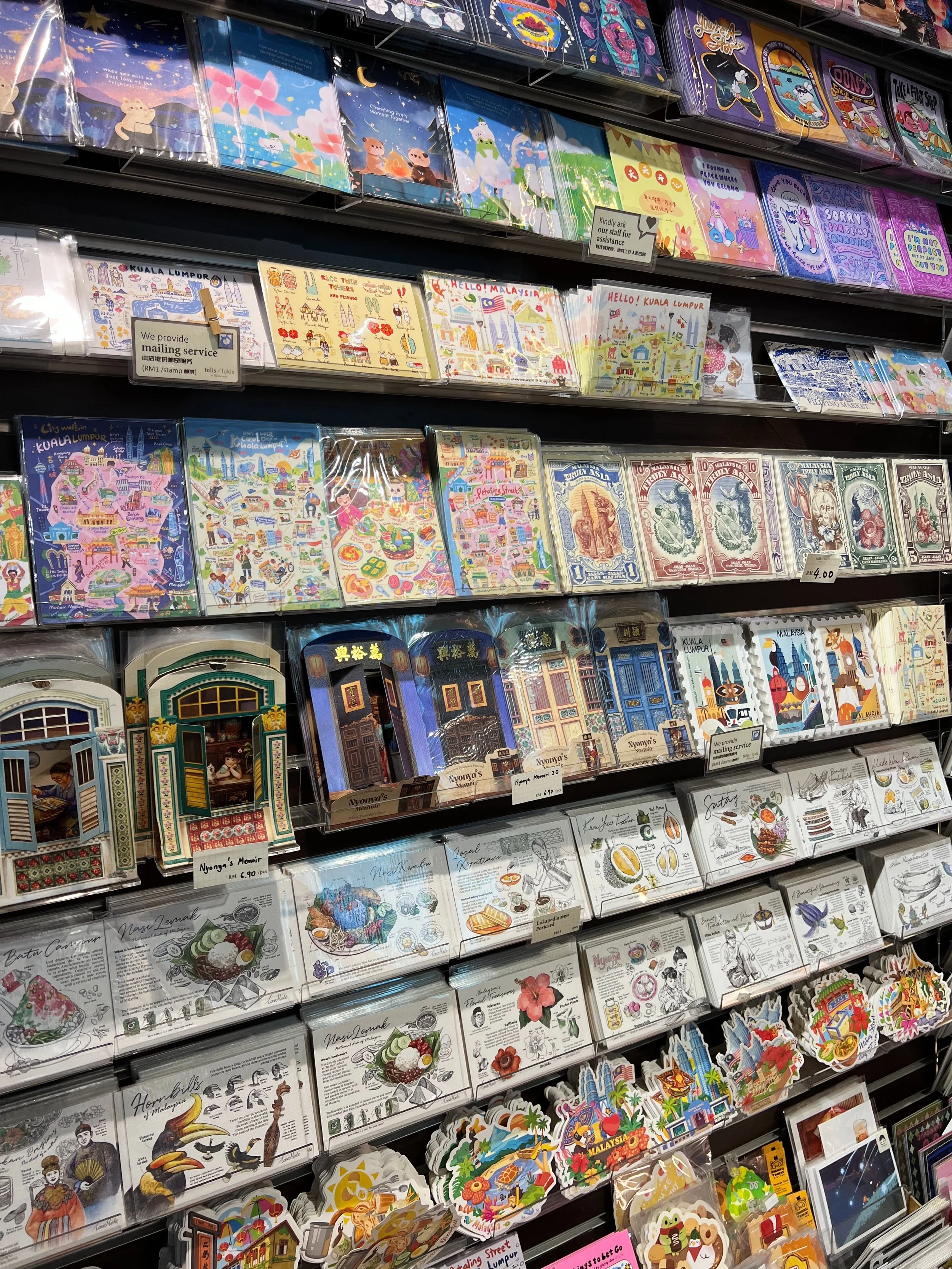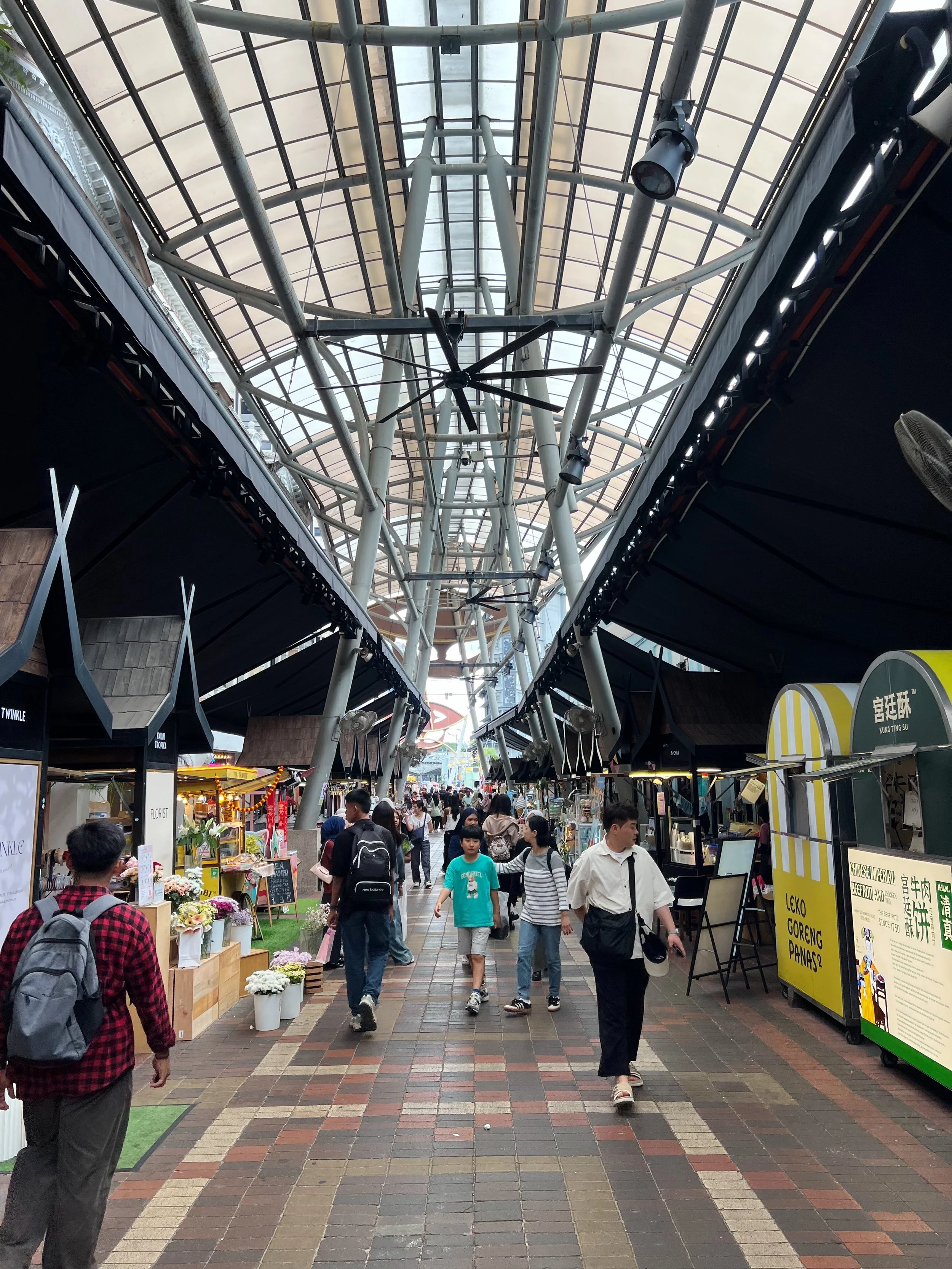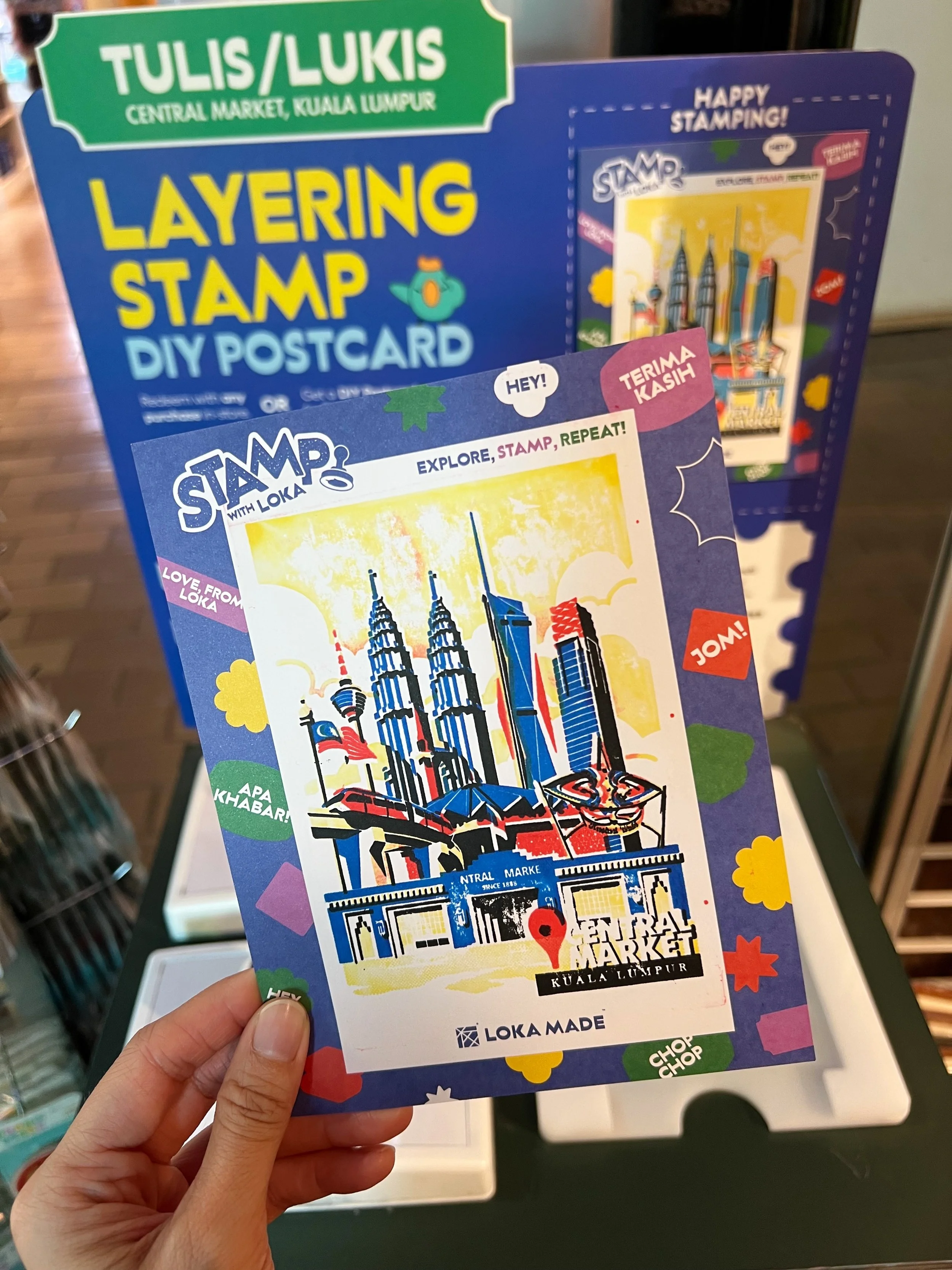 Post lunch we headed to Central Market, the iconic blue building built back in 1888 as a wet market. It has now turned into a cultural center with boutique shops and it’s a great spot for shopping for souvenirs. Not surprisingly I spent a lot of time here shopping for postcards, magnets and other small gifts. One store has a DIY layering stamp postcard where each stamp is a single color and layering the different stamps creates an image of the iconic KL landmarks. Another stall has a Gacha machine for the iconic Malay tea to-go lanyard (it was cat themed and I couldn’t resist). After shopping in the main floors we went onto the top floor and discovered a food court and decided to try the actual Malay tea to go, served in a plastic bag tied with a string and with a straw. The teh ais (iced tea) was delicious and so cheap!