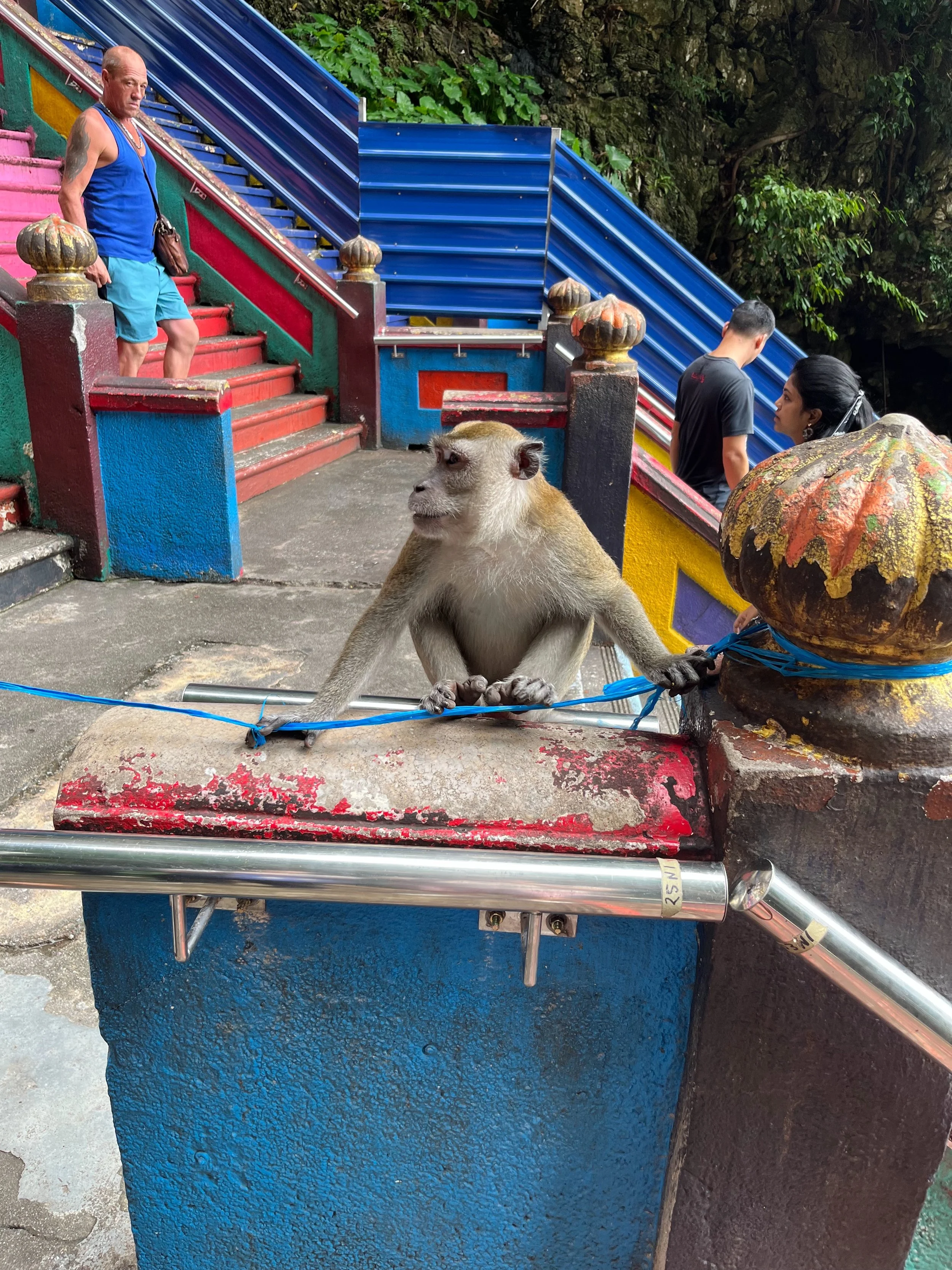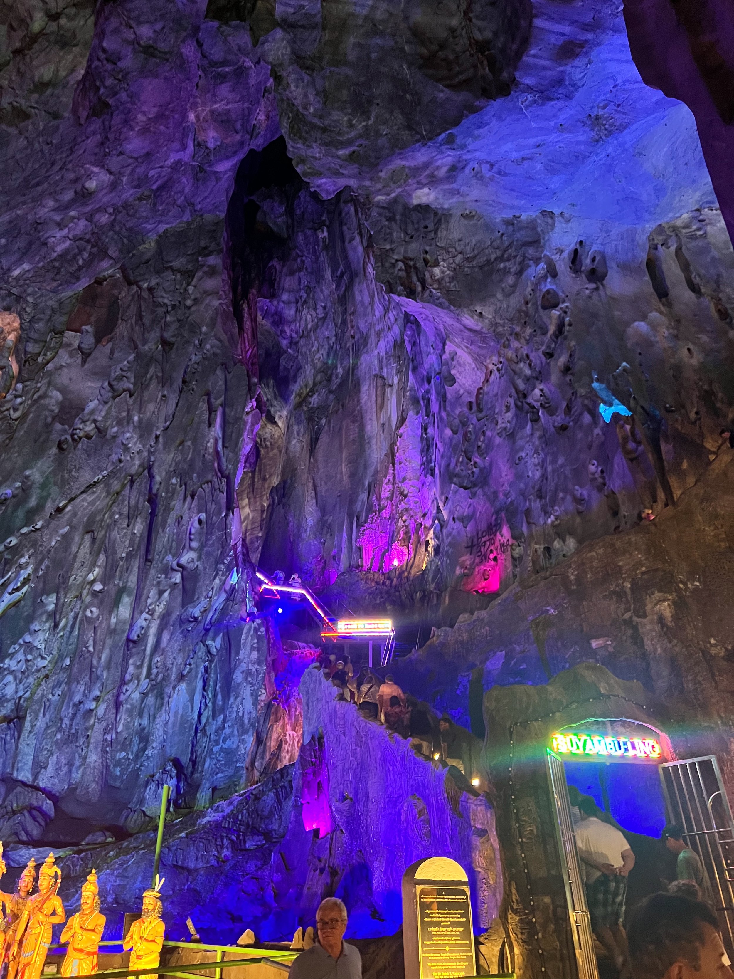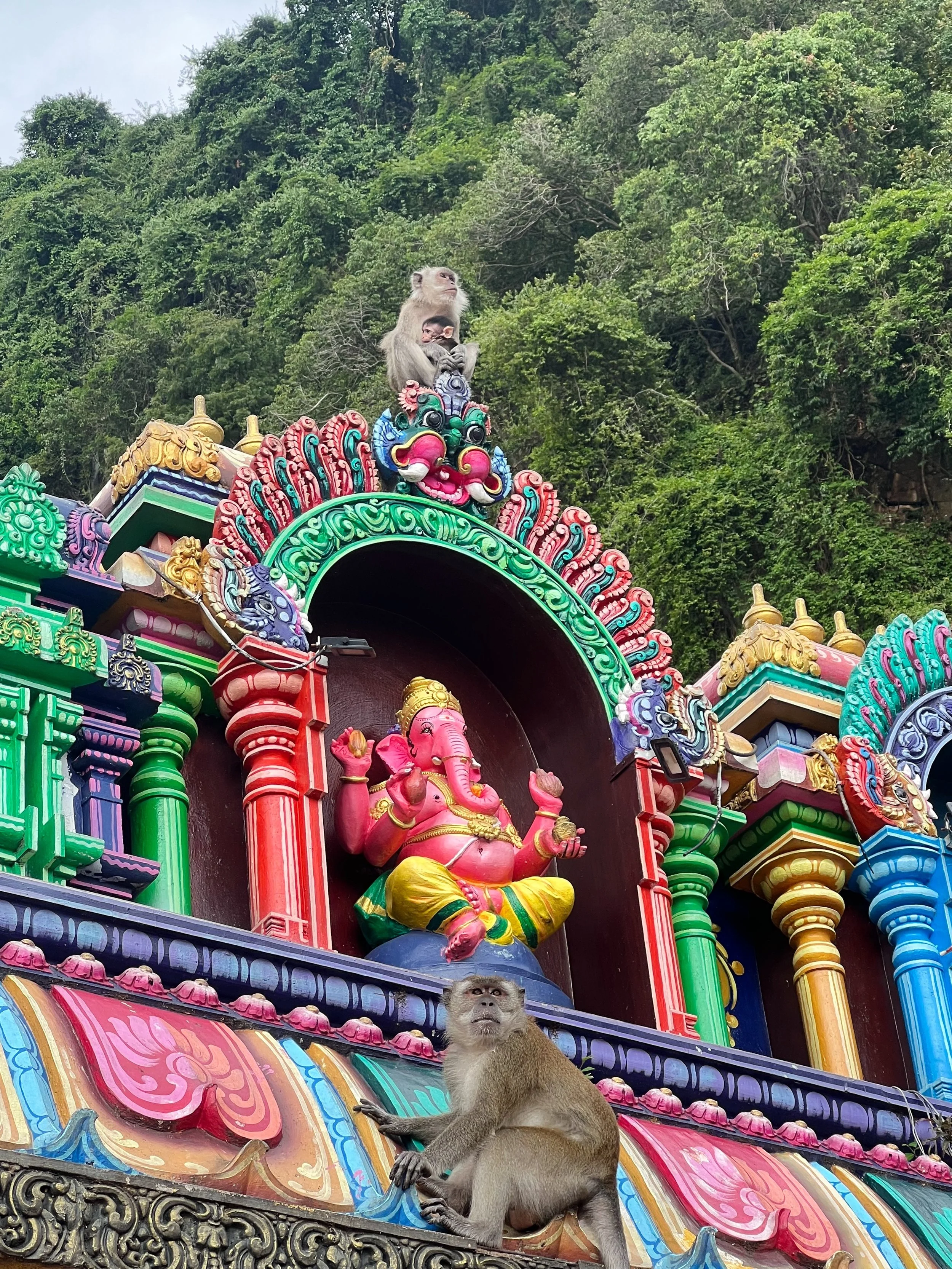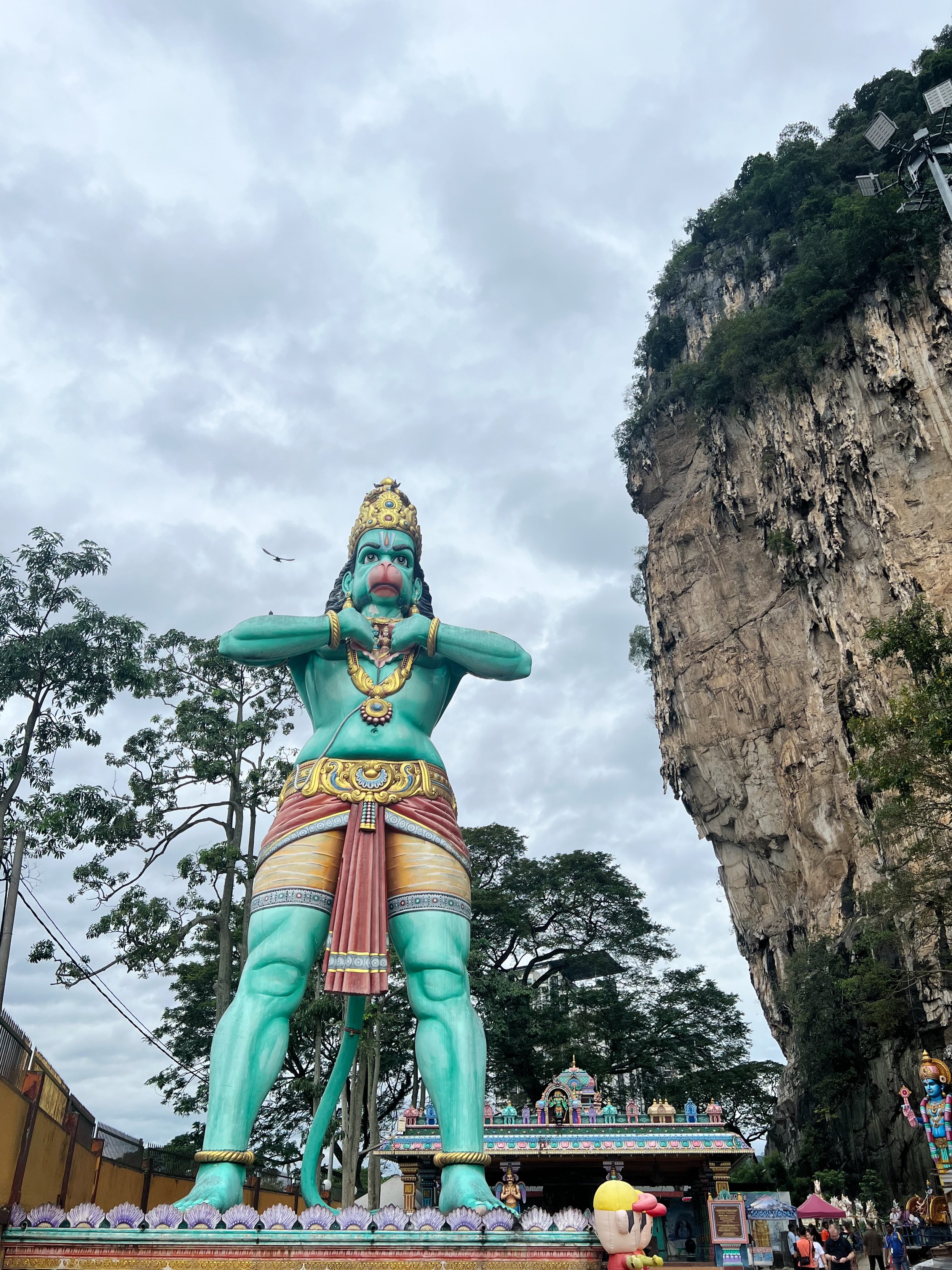 It’s my brother’s birthday and we’re celebrating in KL! We’re switching hotel today from one side of the city to another so we packed up our bags and stored them at the hotel before heading to our first stop of the day, the Batu Caves. It’s series of limestone caves and temples located north of Kuala Lumpur, and most people recognize it by its colorful stairs leading up to the caves, as well as the monkeys that called the caves home. I wished I had done a little bit more research about this place before visiting because as soon as you enter from the ride share drop off location, there is Hanuman, the Hindu God of wisdom and courage, and the entrance to the Ramayana Cave. I had initially mistaken that as part of the Batu Caves, but it’s a separate but complex cave systems that is also worth exploring. The Ramayana Cave features lots of sculptures and murals, as well as a waterfall and a temple all the way at the top of the caves. Perhaps my only complain is the somewhat tacky lighting they’ve chosen for the caves.