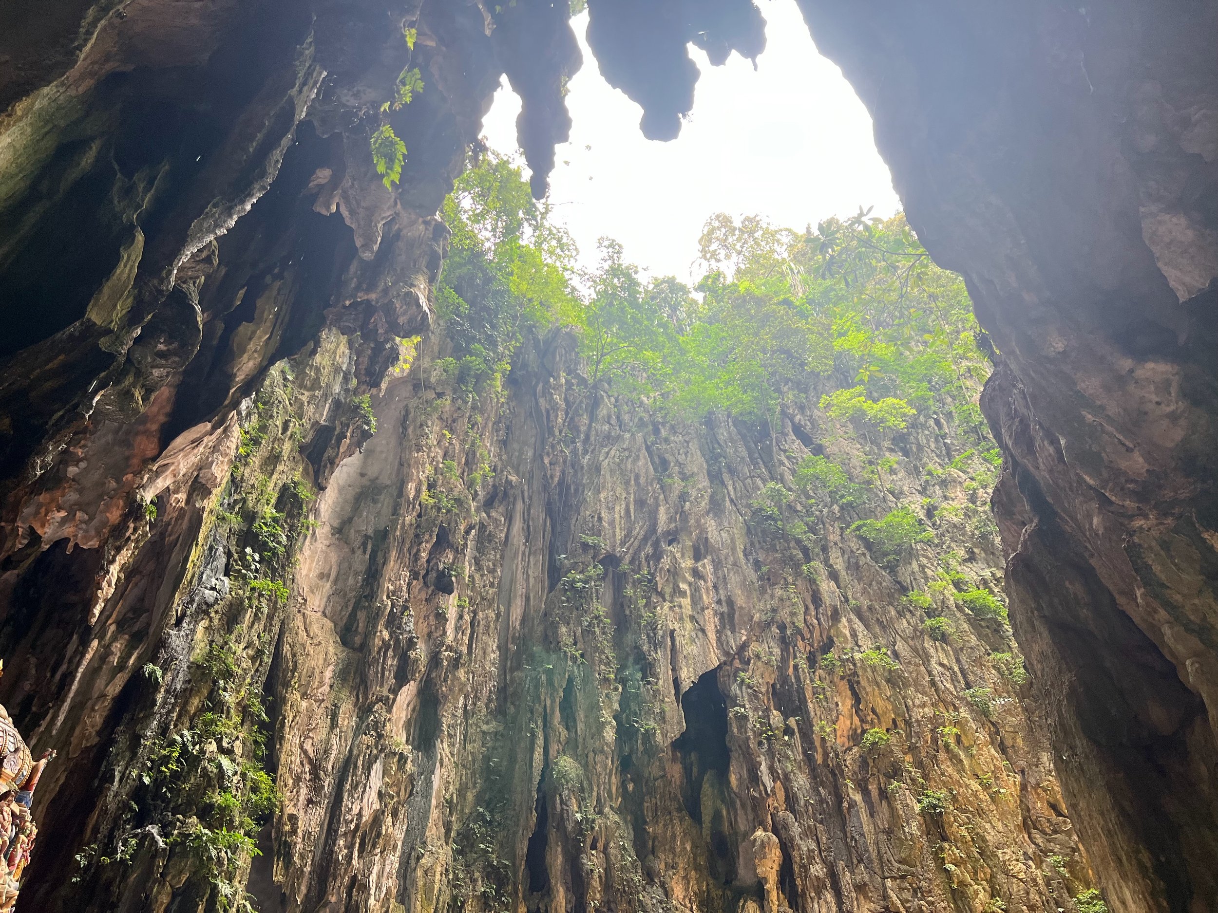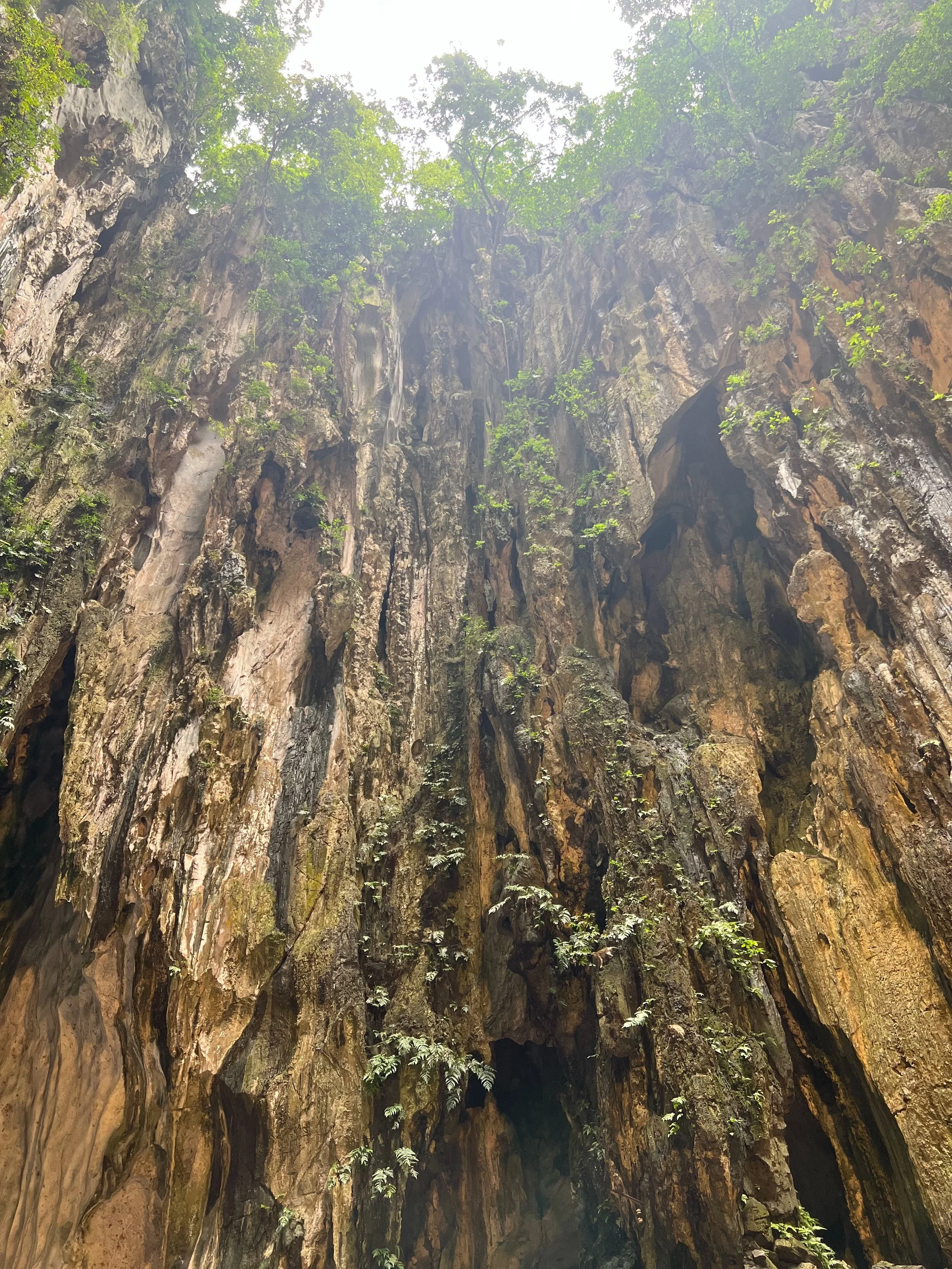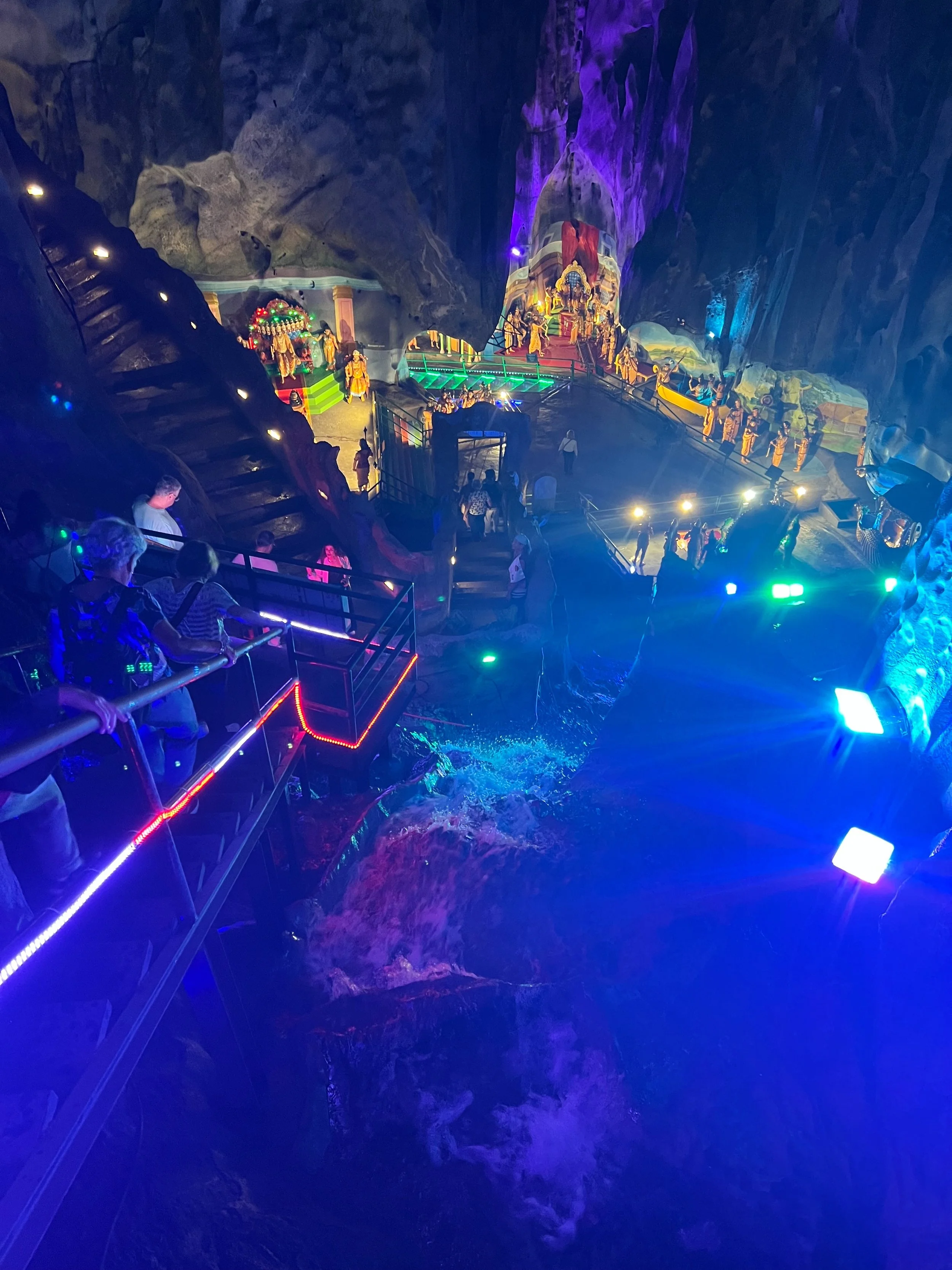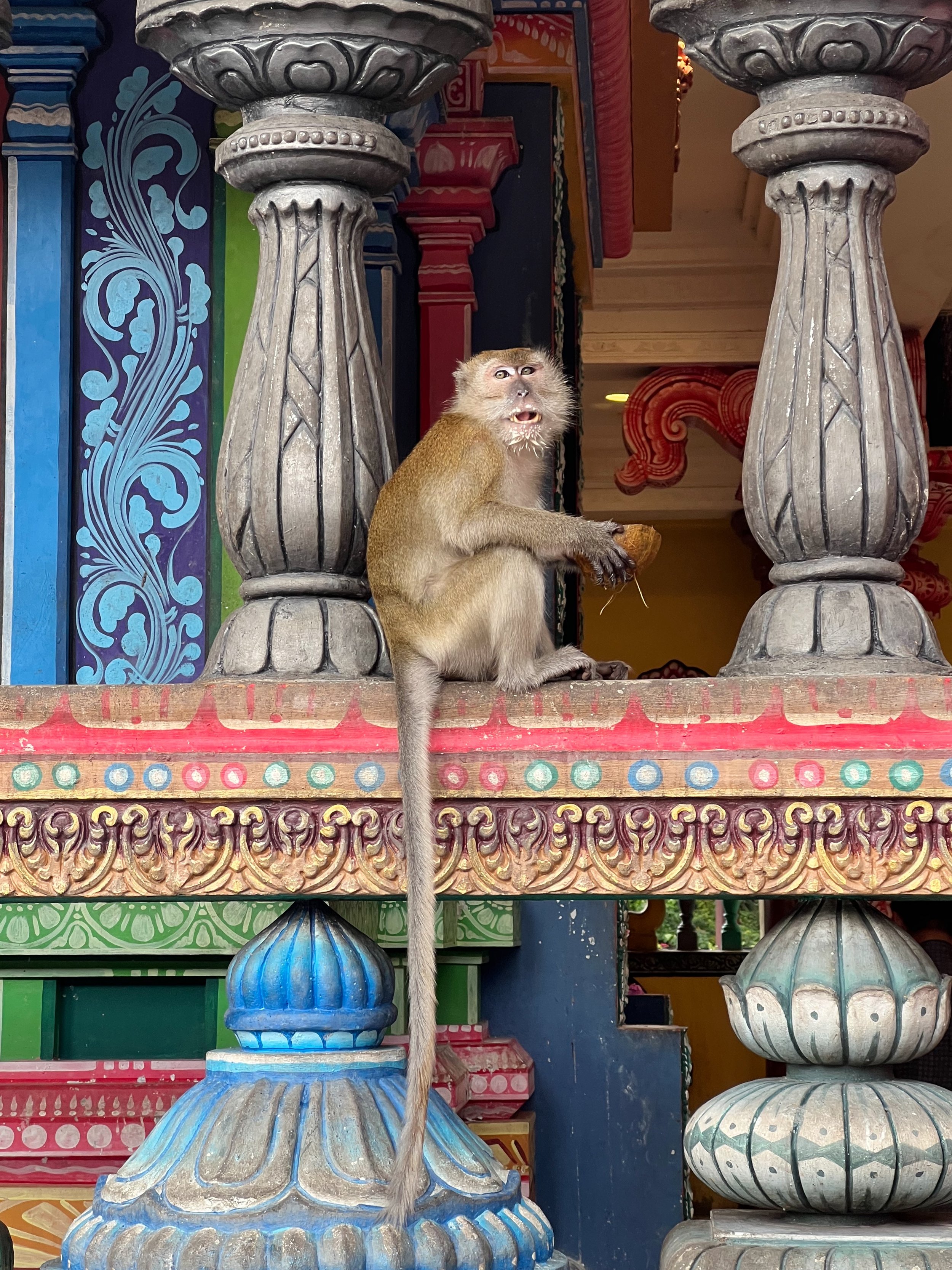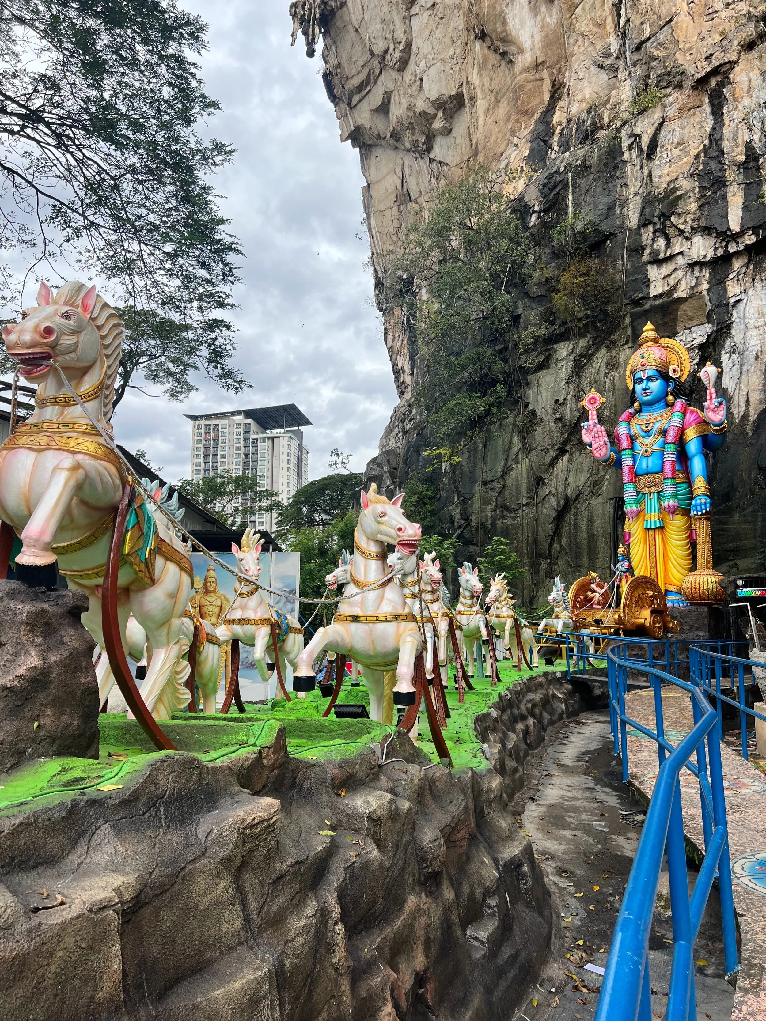 It’s my brother’s birthday and we’re celebrating in KL! We’re switching hotel today from one side of the city to another so we packed up our bags and stored them at the hotel before heading to our first stop of the day, the Batu Caves. It’s series of limestone caves and temples located north of Kuala Lumpur, and most people recognize it by its colorful stairs leading up to the caves, as well as the monkeys that called the caves home. I wished I had done a little bit more research about this place before visiting because as soon as you enter from the ride share drop off location, there is Hanuman, the Hindu God of wisdom and courage, and the entrance to the Ramayana Cave. I had initially mistaken that as part of the Batu Caves, but it’s a separate but complex cave systems that is also worth exploring. The Ramayana Cave features lots of sculptures and murals, as well as a waterfall and a temple all the way at the top of the caves. Perhaps my only complain is the somewhat tacky lighting they’ve chosen for the caves.
