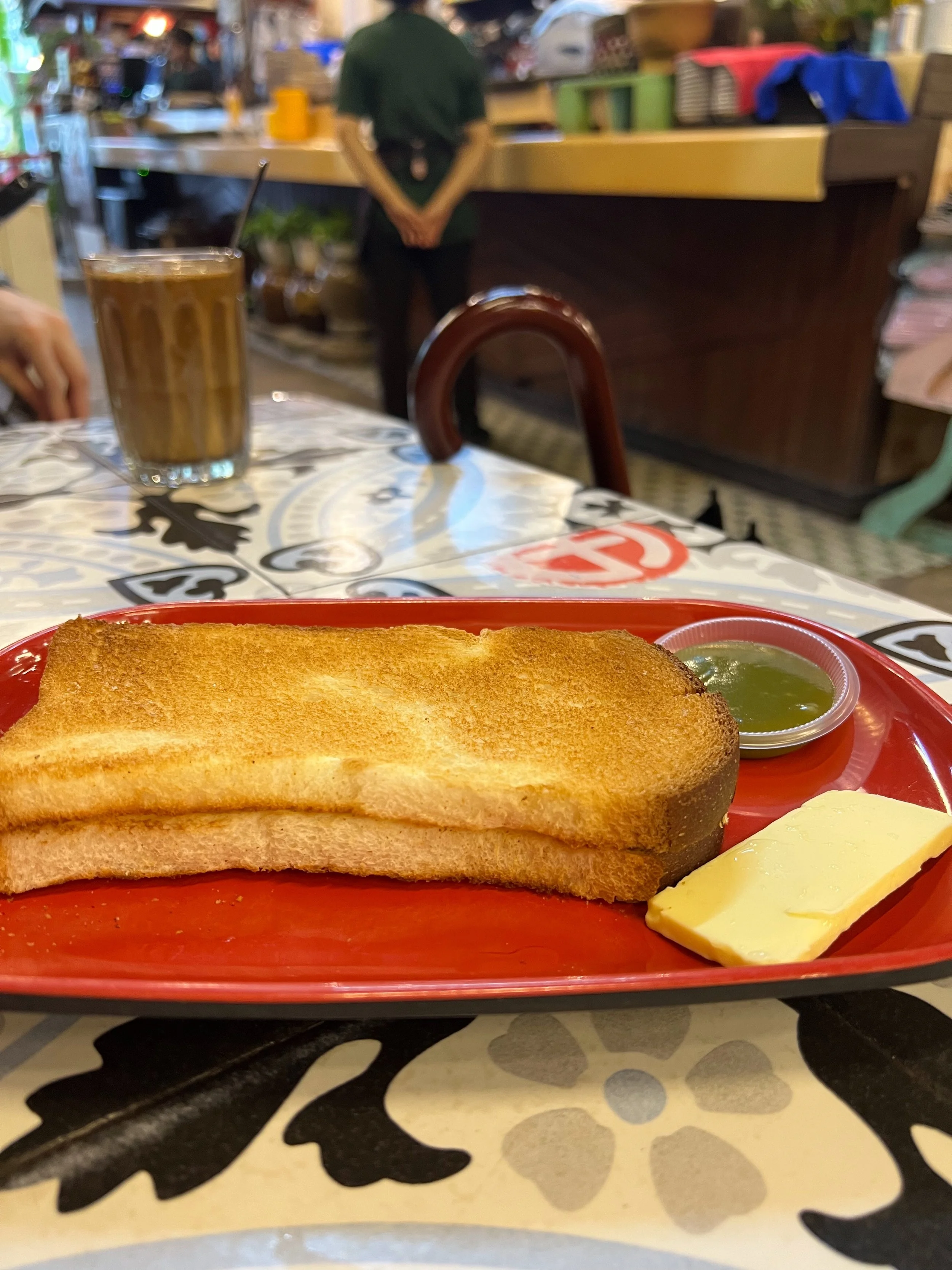 We then headed back to town for an afternoon snack at a Kafei Dian, a coffee shop inside an old post office in the Chinatown area. I had the kopi (coffee with condensed milk) and a kaya toast while my brother got the white coffee with the chicken floss croissant.